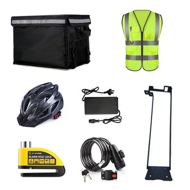 Delivery thermal box, High visibility vest, Helmet, Fast speed charger, Brake pad alarm lock, Frame lock, Battery lock